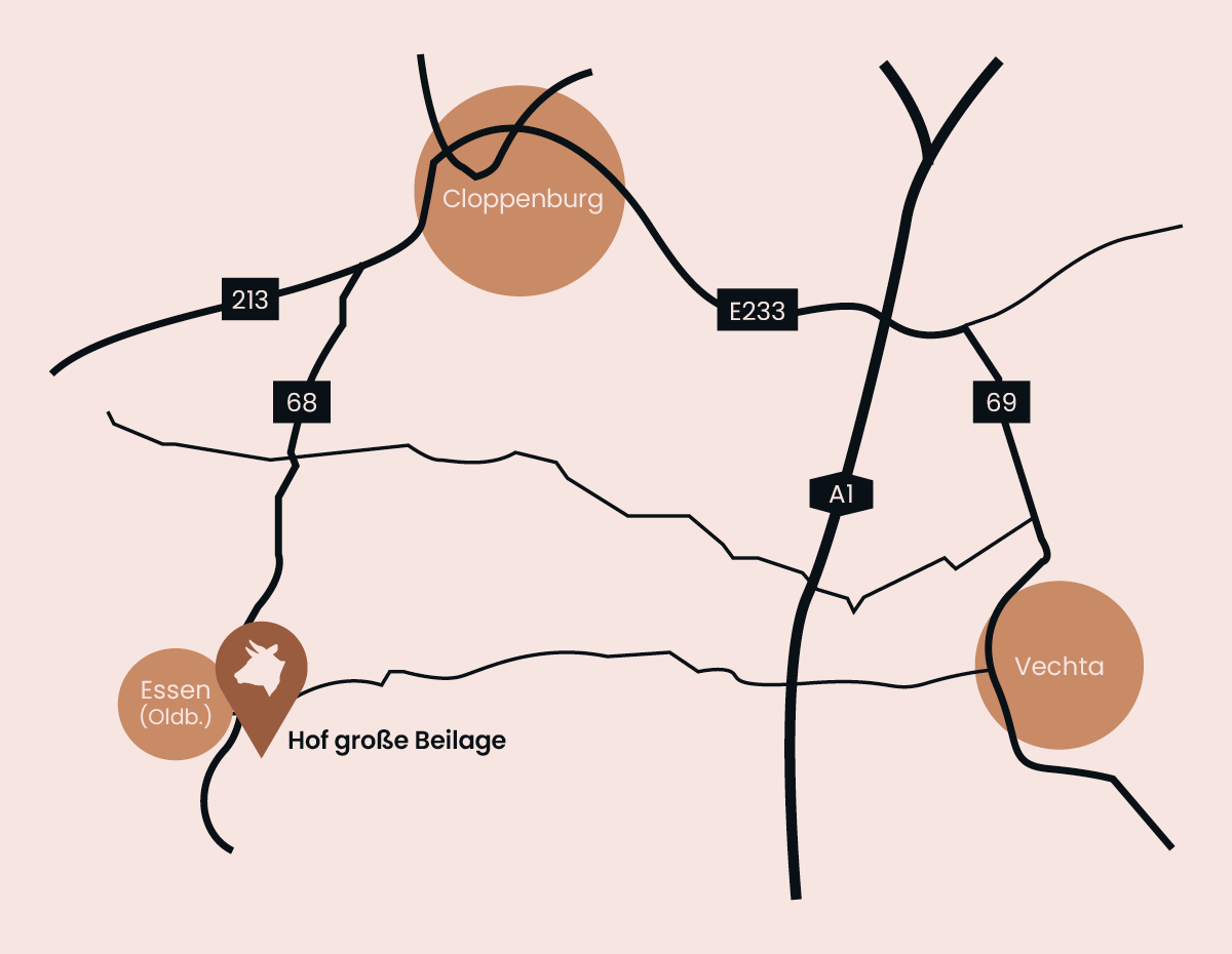 Achten Sie bitte darauf, dass Ihr Navigationssystem Sie von der B68 zunächst auf die Straße Zur Beilage führt. Eine Zufahrt von Osteressen aus über die Straße Zum Brockhagen Stau ist nicht möglich.